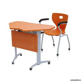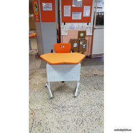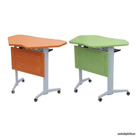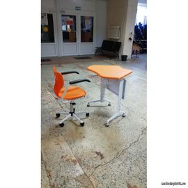 Школьная парта-трансформер в виде трапеции. Мобильная, на роликах. Легко передвигать. Столешница в форме трапеции позволяет составлять комплекты в виде круга. 6 столов комбинируются в круг диаметром 2 метра.