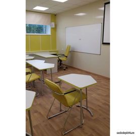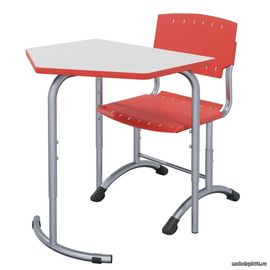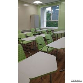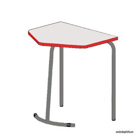 Современная модель школьной парты пяти угольной формы. Для безопасности все углы закруглены. Парта легкая, легко передвигается и может образовывать разные интересные геометрические конструкции из нескольких столов. Торцы парты надежно защищены противоударной кромкой толщиной 2 мм. Каркас металлический, окрашенный.