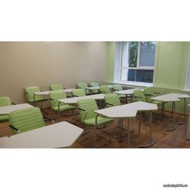 Современная модель школьной парты пяти угольной формы. Для безопасности все углы закруглены. Парта легкая, легко передвигается и может образовывать разные интересные геометрические конструкции из нескольких столов. Торцы парты надежно защищены противоударной кромкой толщиной 2 мм. Каркас металлический, окрашенный.