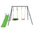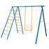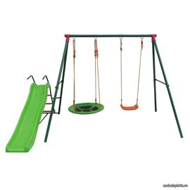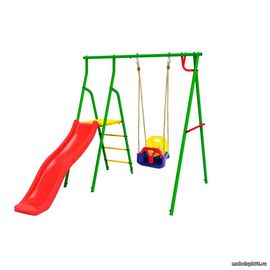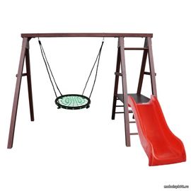 Комплектацию можно менять, добавив различные виды качелей, а также дополнительные элементы. Все детали конструкции надежно зафиксированы металлическими крепежами и закрыты пластиковыми заглушками для детской безопасности.