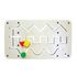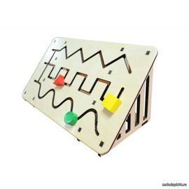 Панель установлена под эргономичным углом. На ней сделаны три тактильные дорожки с ручками в виде геометрических фигур. Дорожки соединены каналом — так получается один увлекательный лабиринт. Путешествуя по нему, ребенок совершает разнообразные движения: по дуге, горизонтальные, вертикальные, вверх-вниз.