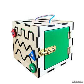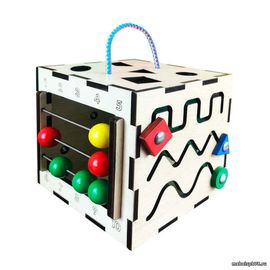Бизикуб — крепкая красочная игрушка для разностороннего развития детей по методике Монтессори. На 5 сторонах куба находятся модули из жизни взрослых. Гладкая сторона — устойчивое основание. Комплектация бизикуба: 5 разноцветных шестеренок; дверка с щеколдой; три тактильные дорожки; счеты с большими цветными костяшками; панель с отверстиями* «Геометрические формы». *К панели с отверстиями фигуры в комплекте не предоставляются.
