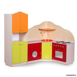 Игровая зона "Хозяюшка" с имитацией большого холодильника, может быть использован для хранения прочего игрового инвентаря. Имитация крана, раковины, конфорок, стиральной машины, духовки. Цвета - на выбор. Прекрасно подойдет для дет.садов. игровых комнат или детской комнаты.