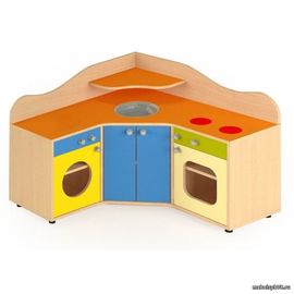 Угловая детская кухня прекрасно подойдет для для ДОУ, детских игровых центров и детских комнат ожидания. Помимо стандартных изделий изготавливается оборудование на заказ с учётом пожеланий, функциональности, габаритов, индивидуальных особенностей и стоимости.