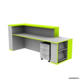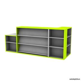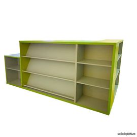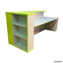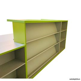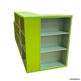 Интересное решения для выдачи книг в библиотеки. Стойка угловая. По фасаду она представляет собой стеллажи для размещения книг. Центральные секции кафедры для выдачи книг имеют наклонные полки для демонстрации печатных изданий. Стойка для выдачи книг оснащена удобной мобильной тумбой с ящиками для работы библиотекаря, а также широкой рабочей столешницей.